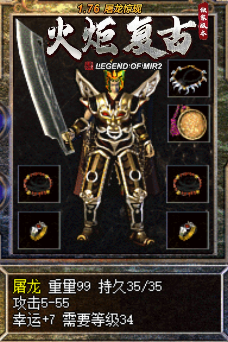 所有装备在游戏中都能打到,终极装备为屠龙、赤月套装!
